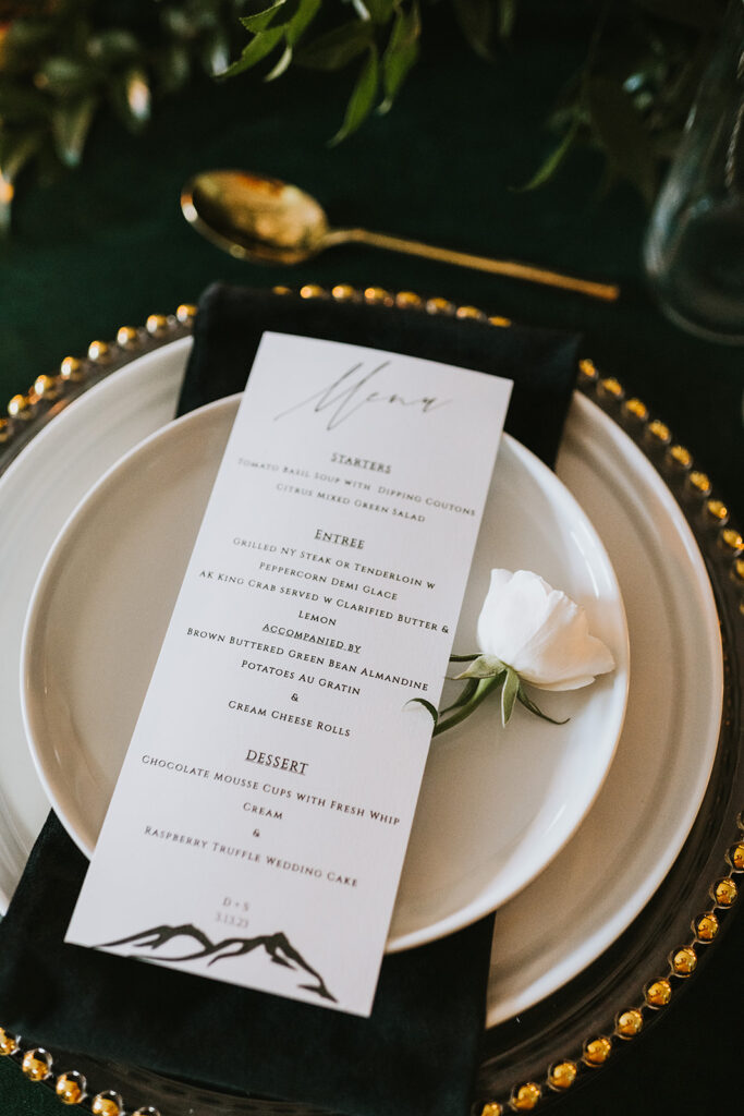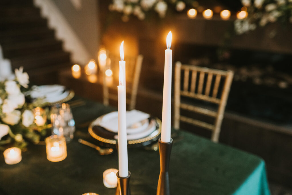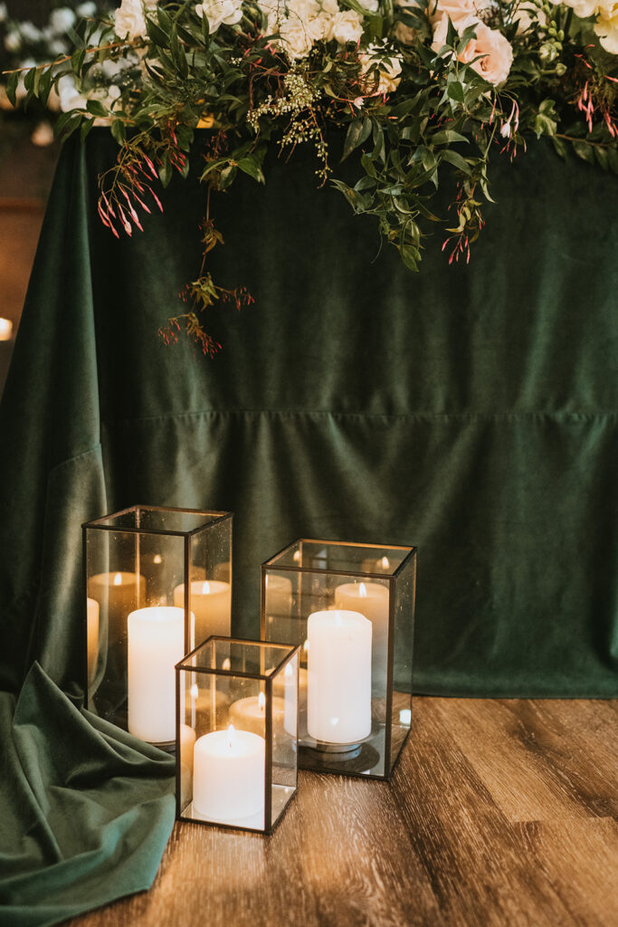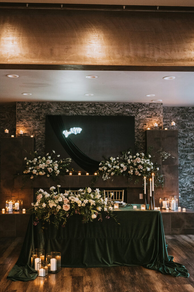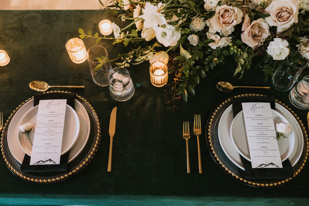 While Deanna and Scott were having their epic helicopter tour, we were back at the Airbnb setting up for their intimate dinner. Even though it was just the two of them, we wanted to make it as magical as a full wedding reception. The stunning florals from the ceremony continued along with a luxe green velvet linen. Then we added personal touches and romantic candlelight for a perfect evening.