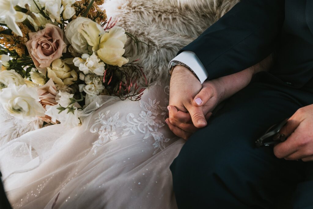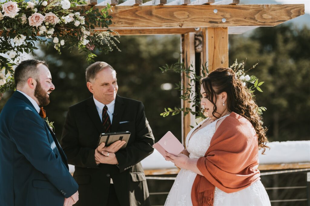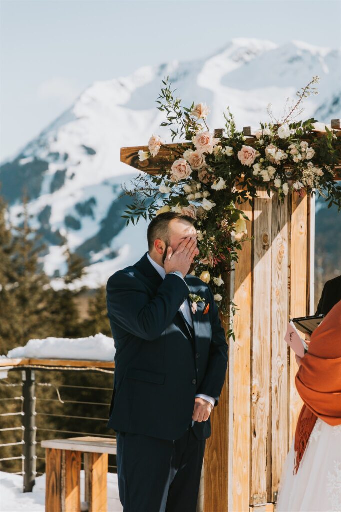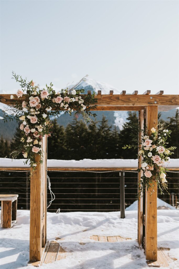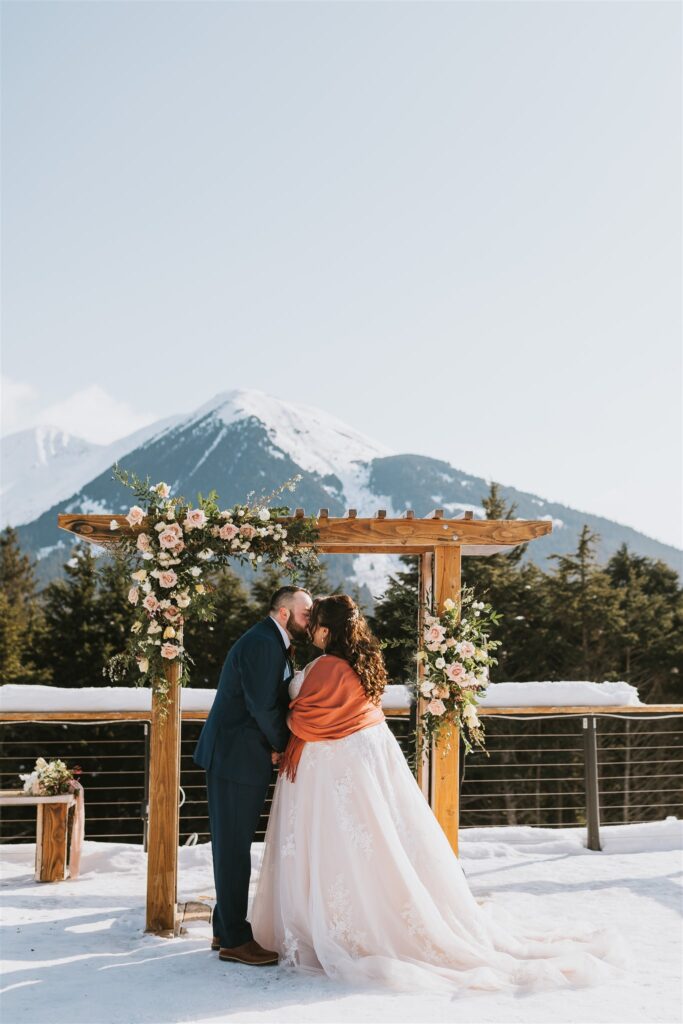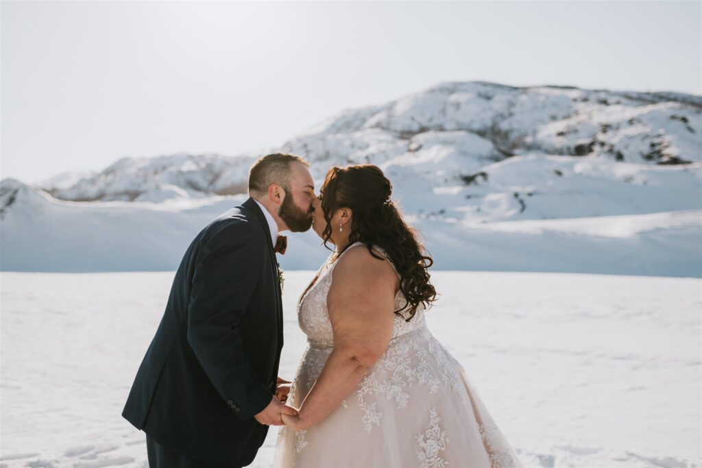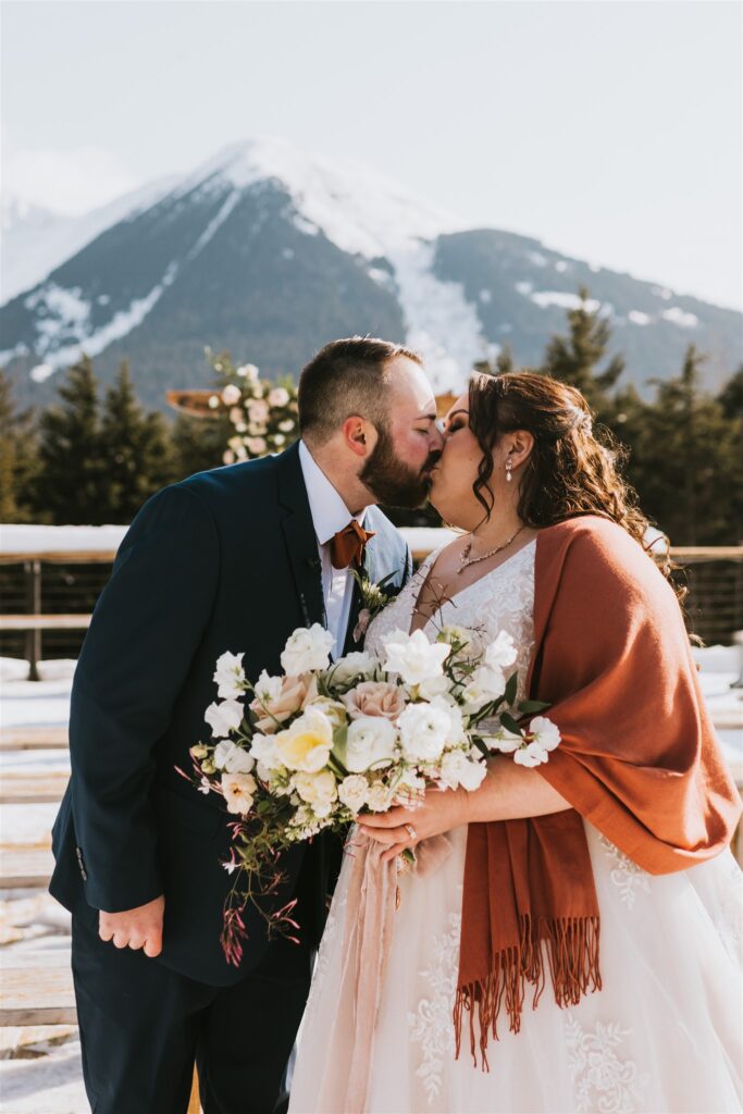 As an experienced Alaska elopement planner, we have planned many elopements and we fully take care of the set up, logistics, and all the details. We were able to set up everything needed for the ceremony while the couple was getting ready. We carefully selected Honeybloom Floral to achieve their floral goals. Melissa created the most romantic and stunning florals which was an important element for the couple. The groom walked in first followed by a traditional bridal entrance to the song “Take My Hand”. During the ceremony, they read their own vows which led to a few tears as well as a few laughs. Then of course, they sealed the ceremony with a kiss.